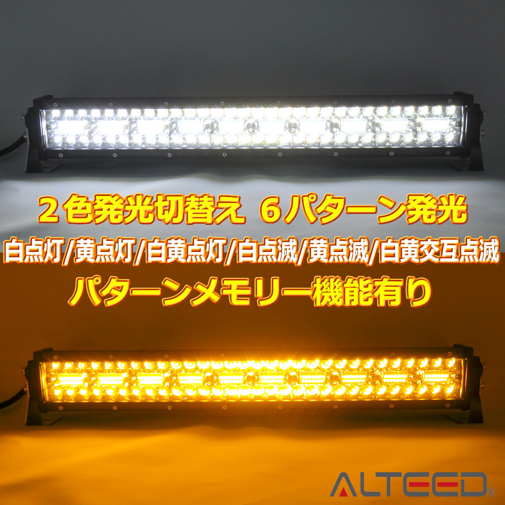 | □照明灯、ワークライトに最適なLEDライトバーです。 □2色の発光を切替え可能なので、ご使用シーンに合わせて1台2役のご使用をいただけます。 □各色フラッシュ点滅と全点灯パターンの切替えが可能です。 □LED配置、反射ミラーレンズを異なる配列で配置した2WAYデザイン。 □ミラータイプの反射レンズを搭載。LED数以上にミラー反射するのでより明るく光ります。 □10-30V対応なので12V乗用車から24V大型トラックまで幅広い用途に適合します。 □IP68規格、防水防塵仕様です。 |