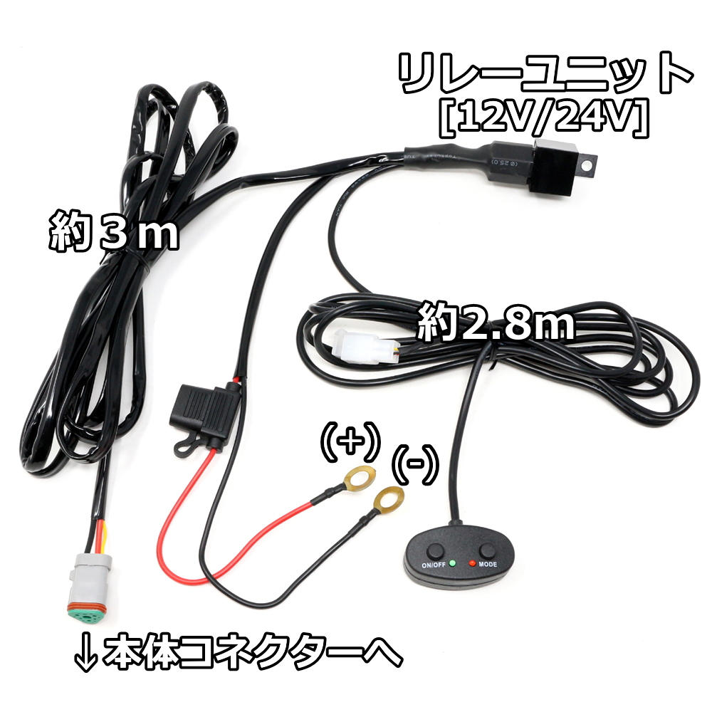 | 個数:1個 作動色:白/黄 作動パターン:白点灯/黄点灯/白黄点灯/白点滅/黄点滅/白黄交互点滅 サイズ:555x72x52mm(ブラケット含まず) 質量:約1500g 対応電圧:DC10-30V 定格消費電力:130W 消費電流(全灯点灯時):12V=4.5A/24V=2.0A 色温:6000K(白色)/1800K(黄色) 防水防塵規格:IP68 作動温度:-30℃~+60℃ 主素材:アルミダイカスト/PC/ステンレス(ブラケット) 認証規格:CE 【取付方法】 配線: 赤(+)/黒(-) 12V用と24V用対応の脱着式リレーユニットがそれぞれ付属します。 ご使用車種の電圧に合わせてお選び下さい。 ※12V用リレー使用状態で24V通電しますと回路破損しますのでご注意ください 【操作方法】 スイッチ[ON/OFF]を押すと作動します(電源ランプ点灯) [MODE]を押すとパターン6種類が順に切り替わります。 メモリー機能により再起動時も同じパターンから作動します。 ※スイッチ部は防水仕様ではありません。水濡れ無い箇所へ設置して下さい。 |