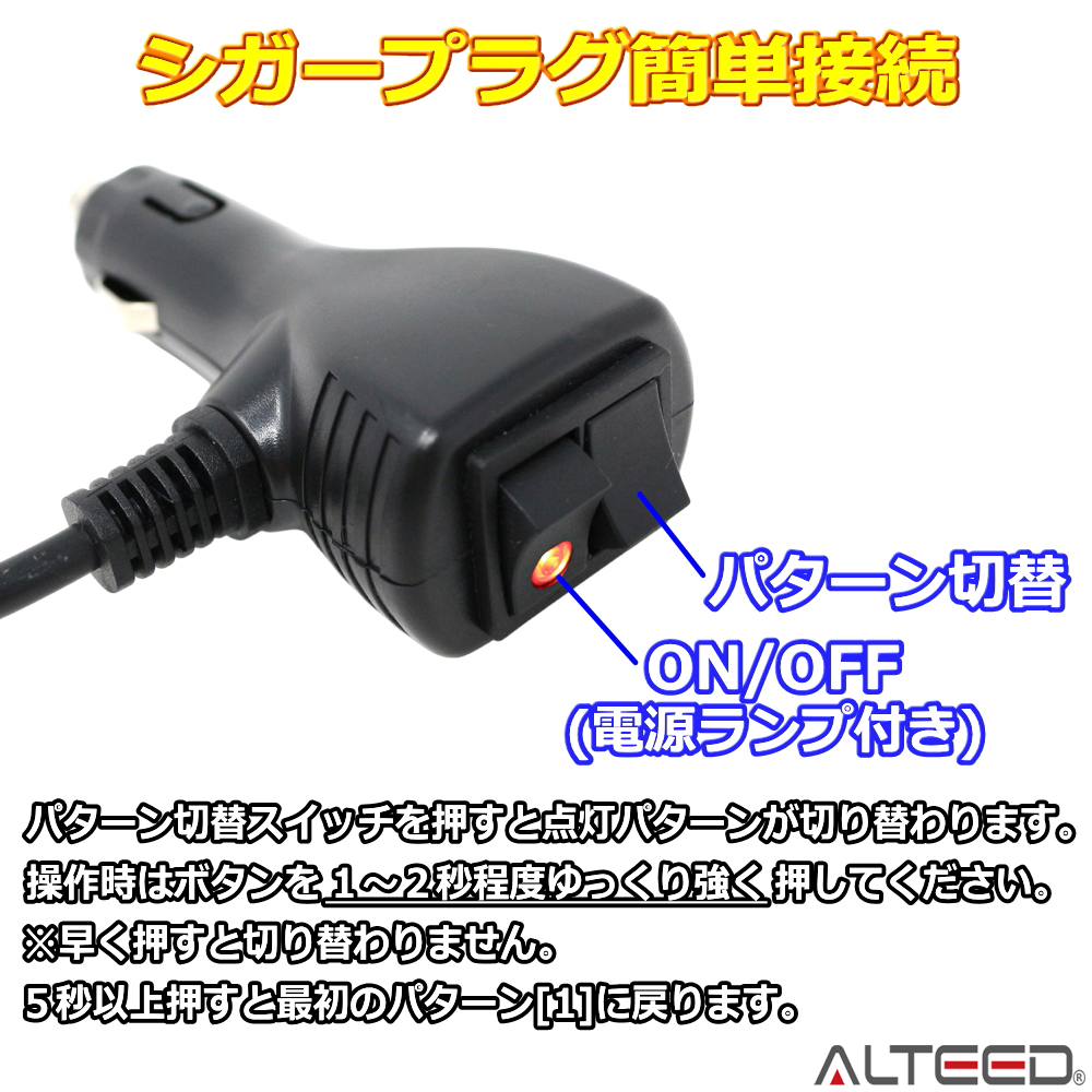 2色発光切替可能。側面ミラーにLEDを反射照射、全面発光のように明るく発光します。フラッシュ、回転、交互、全点灯等、26パターンの多彩なアクション。