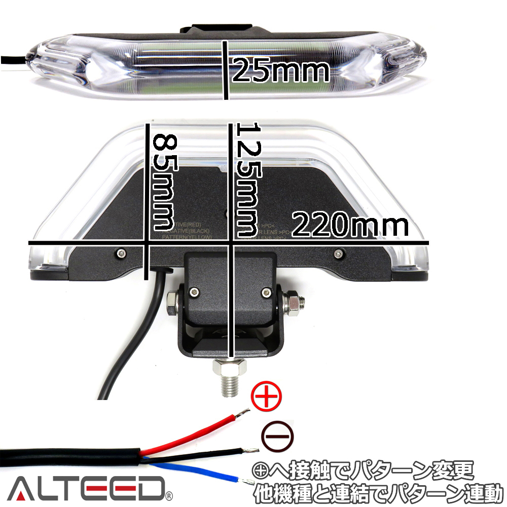 | 商品数:1個 点灯パターン:12種(全点灯,フラッシュ等) 対応電圧:DC10-30V 消費電流:12V=0.5A-3.0A /24V=0.3A-1.3A サイズ:220x25x125mm 質量:約550g 素材:アルミダイカスト,PC,ステンレス(ステー部) 防水規格:IP67 作動環境:-40℃~+65℃ EMC規格認証:ECE R10/R65class2 SAE J578/J845class1 【ご使用方法】 配線赤色を+、黒色を-側へ接続して下さい 青色配線を+側へ接触させると点灯パターンが切替ります。お好みのパターンになるよう接触を繰り返して下さい。パターンを設定するとメモリー機能により次回以降は設定パターンで作動します ※パターン設定後は青色配線が通電しないよう絶縁して下さい [連動方法(最大6台)] 各機器の点灯パターンを同じに揃えます(まだ青色は連結しない) 似たようなパターンが多いので、常時点灯パターンに合わせると解り易いです パターンを合わせたら青色配線を連結します。連結した状態でどちらかの赤色配線へ接触させてパターン切替えを同時に行うとタイミング連動します |