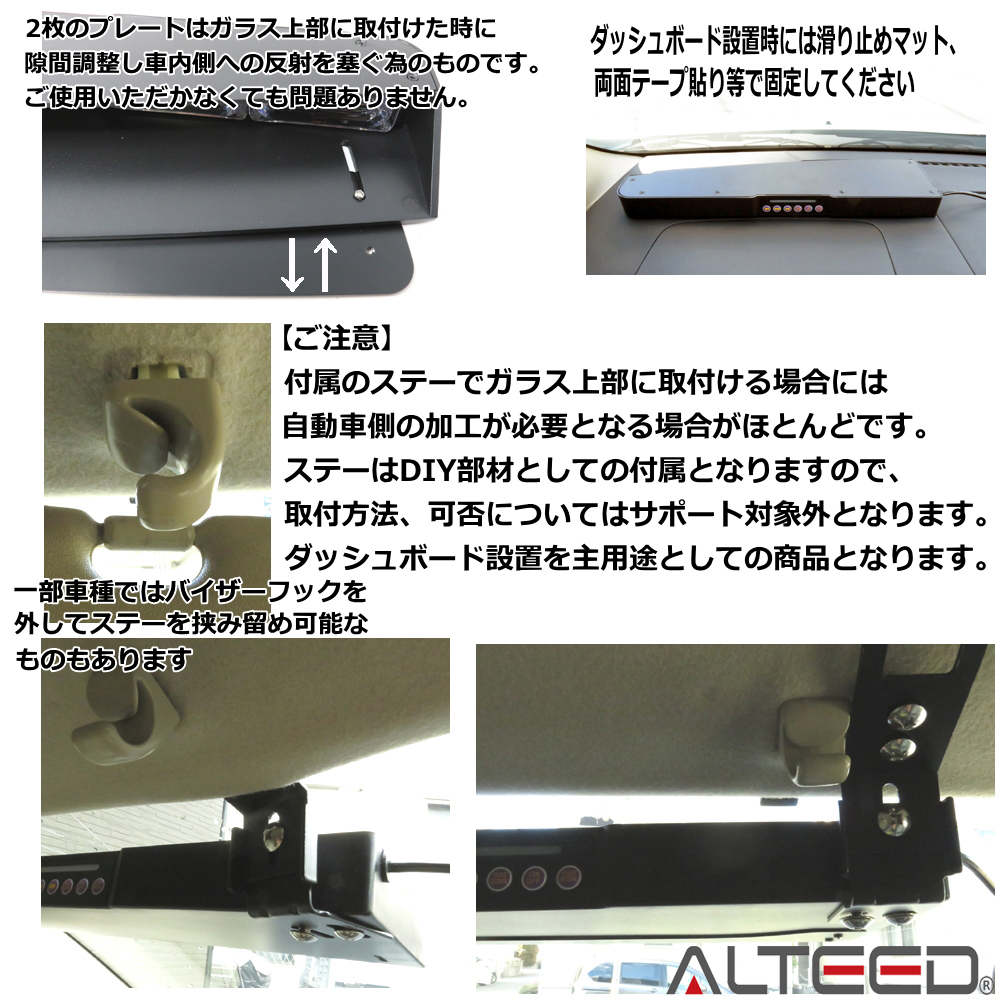 | 作動パターン:点滅、交互、流動、点灯等29パターン 本体サイズ:433mm×155mm×35mm 配線長:本機~シガープラグ約3m/左右間約0.7m 質量:本体約1500g(片側のみ、金具含まず) 対応電圧:DC12V 消費電流(平均):1.2A 防水規格:非防水 作動温度:-30℃~+60℃ 主素材:PC 【ステー部材について】 ガラス上部設置用のステー部材が付属しますが、当商品はダッシュボード据え置き規格品となり、必ず適合するものではありません。加工用部材としての付属となります。 ガラス上部に設置する場合には、一部車種についてはサンバイザーステーを外して挟み込み固定する事も可能ですが、ほとんどの場合は車体側への加工設置が必要となります。 取付け方法、可否についてはサポート対象外となりますのでご了承ください。 ダッシュボード設置時にはゴムマット、両面テープ留め等により滑り止め対策を行ってください。 |